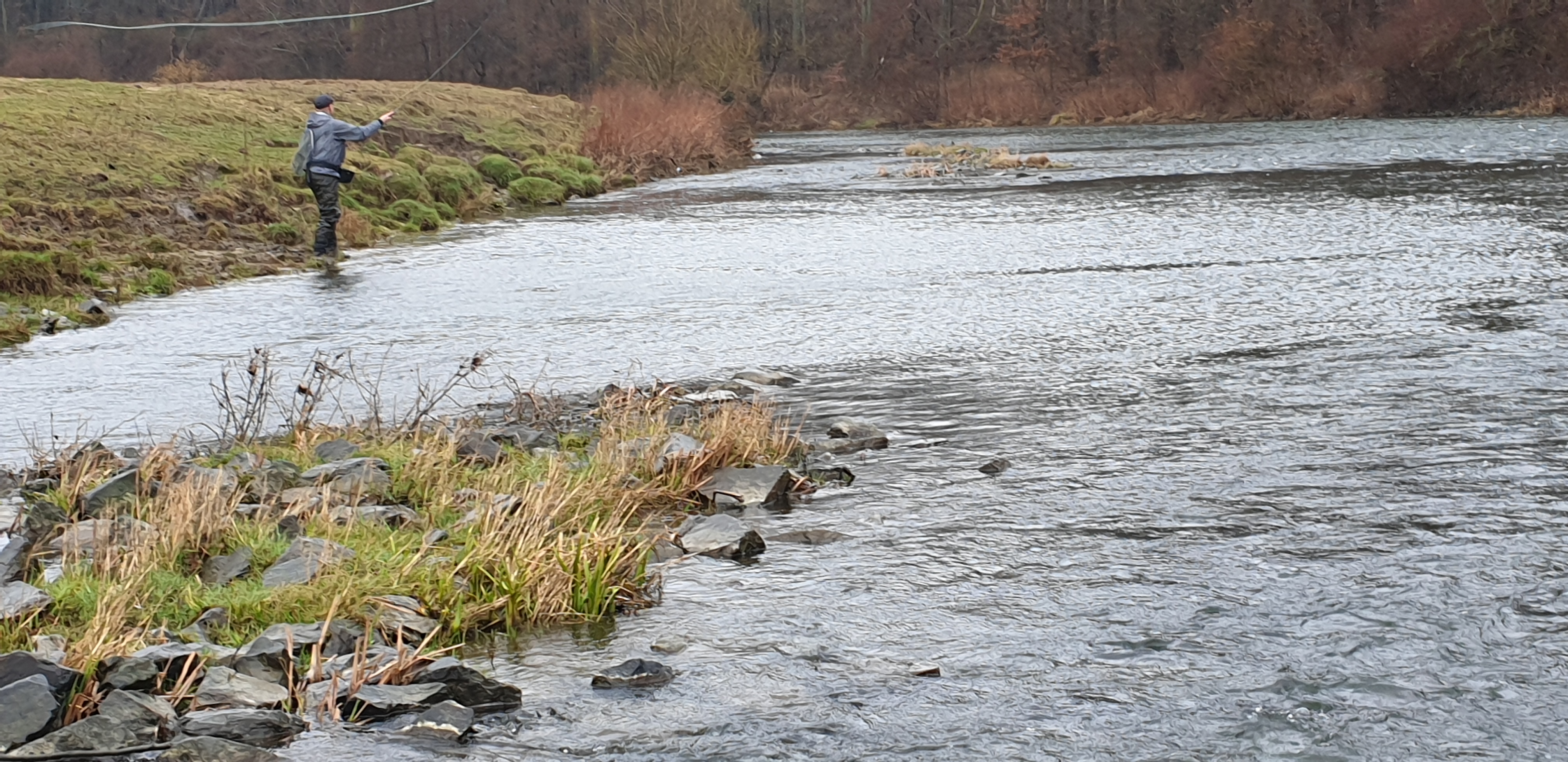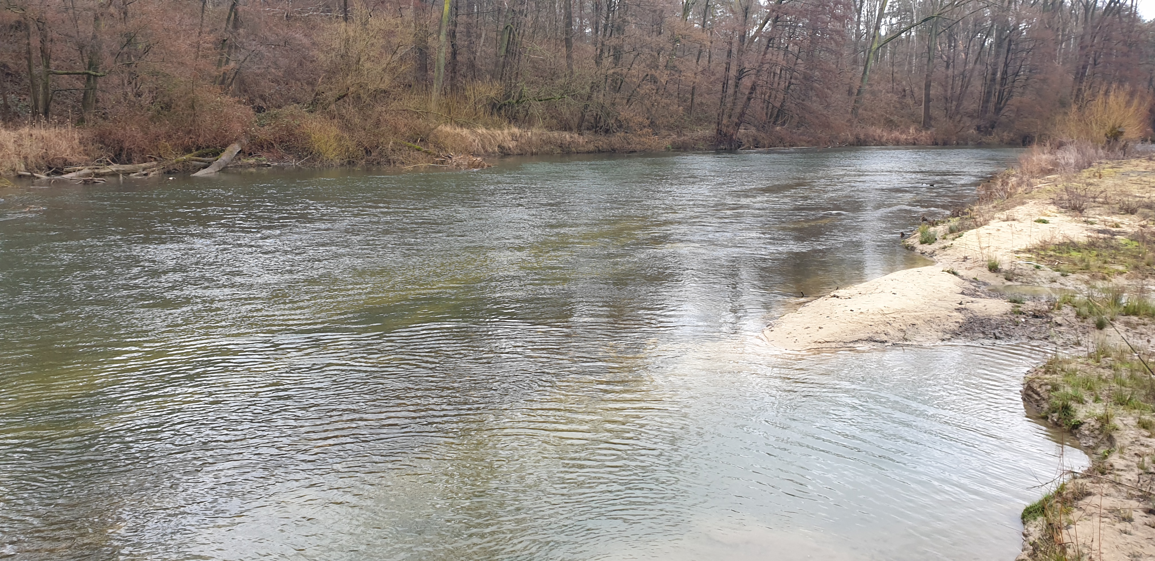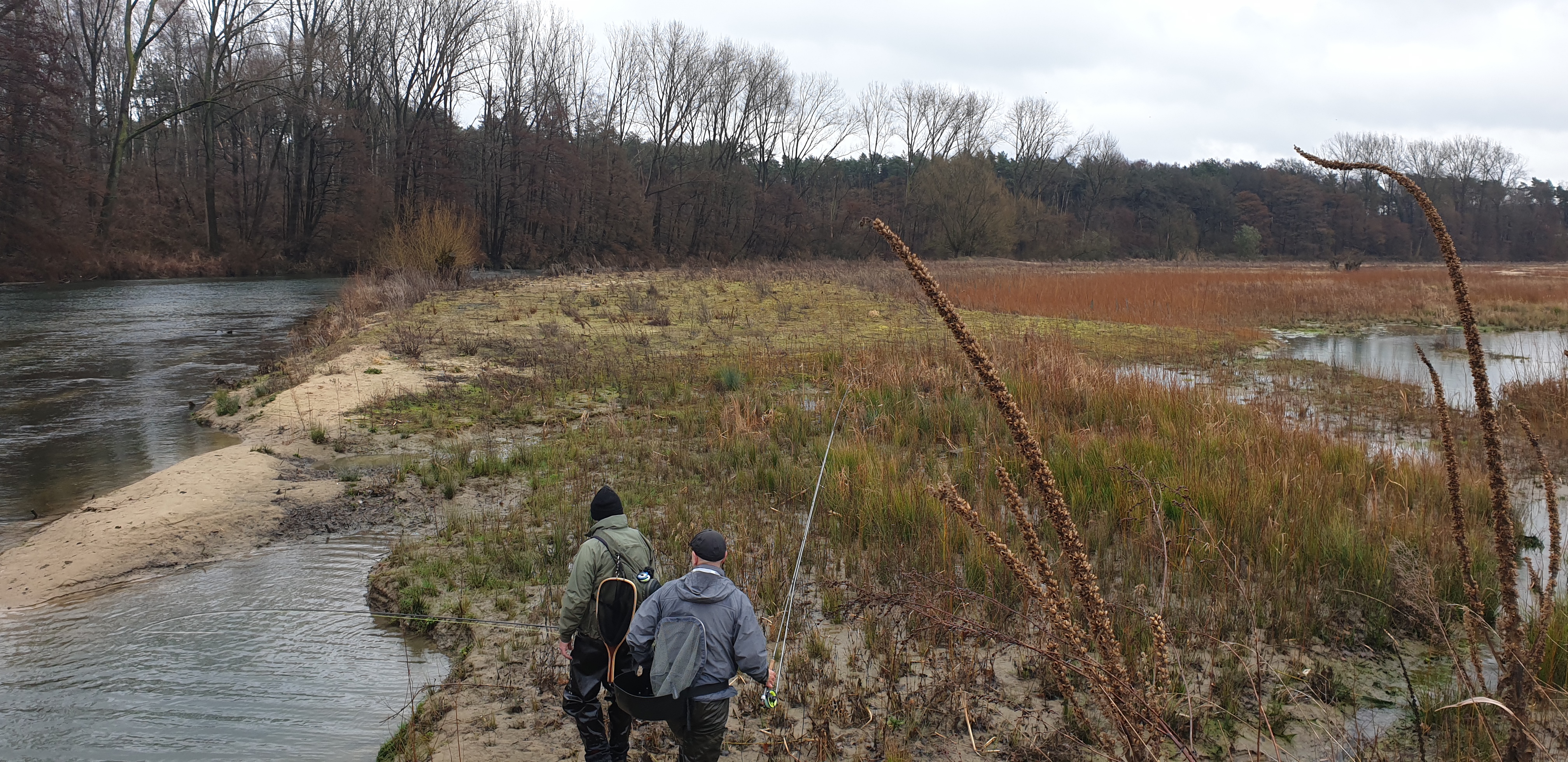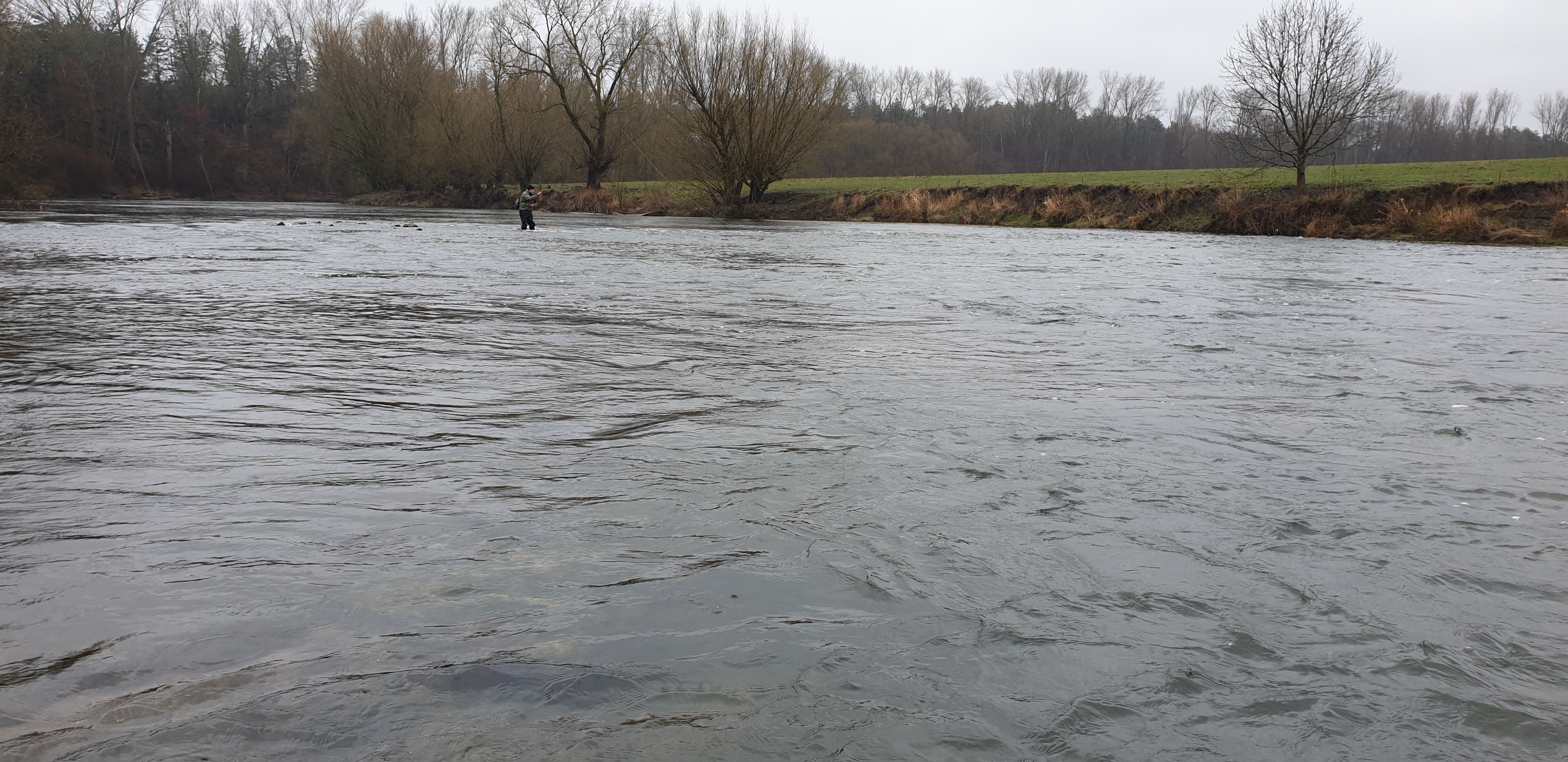 Man sieht es in online Videos immer häufiger, Zweihandruten oder Switch Ruten für den Lachs- und Meerforellenfang. Wäre das nichts für die Karup Å im Sommer? Oder mal die Stunde Fahrt auf sich nehmen und damit am Rhein auf Rapfen angeln? Oder man lernt den Wolfgang kennen, der einem sagt das er seit vielen Jahren schon um die Ecke an der Lippe mit der Zweihand Rute angelt. Von der Barbe bis zur großen Forelle und auch Rapfen wurden da schon gefangen. Und dass man mit der Zweihand Rute kaum Rückraum benötigt, hat an einigen Stellen deutliche Vorteile. Also haben wir Anfang März einen Termin ausgemacht, den Jörg mit eingepackt und sind Richtung Ahsen gefahren. Toll wenn man einen „Local“ dabei hat, der nicht nur die guten Stellen, sondern auch die Parkplätze in der Nähe des Flusses kennt. Der Wasserstand war leider noch immer etwas niedrig, wobei das Durchwaten an einigen Stellen schon recht kniffelig wurde. Ich glaube ich muss doch mal ein paar Euro in einen Watstock investieren. Wolfgang erklärte uns am Wasser wo es wie tief ist, wo man durchlaufen kann, wie in verschiedenen Ecken die Bodenstruktur ist und vieles mehr. Super Infos und man merkte, er kennt die Lippe wirklich wie seine Westentasche. Da ich im Zweihandwerfen noch recht frisch bin und außer ein paar Trockenübungen und ein paar Würfen am Vereinsteich noch keine Erfahrung gesammelt habe, gab es hier und da ein paar Problemchen. Im Nachhinein stellte sich heraus, dass der Skagit Schusskopf doch nicht falsch bemessen war, sondern es an meinem Wurfstil lag. Nach einer Anfangsphase kam ich jedoch klar und legte los. Die größere Reichweite ohne Rückraum zu nutzen macht die Zweihandrute an der Lippe zur besten Wahl! Ähnlich wie an den Auen kann man in die Strömungskanten auf der anderen Uferseite werfen und die Fliege in der Deaddrift präsentieren. Mit einem Single Spey Cast ist die Fliege nach vollendeter Drift auch ruck zuck wieder auf der anderen Uferseite. Gefangen wurde an diesem Tag leider nichts. Im Grunde war es auch eher unwahrscheinlich, Wasserstand, Temperatur und Jahreszeit waren alles andere als Fanggaranten. Aber Fisch war auch nicht das oberste Ziel. Der gemeinsame Ausflug machte wie erwartet einen riesen Spaß, ich habe sehr viel über die Lippe und das Zweihandwerfen gelernt und die neu renaturierten Bereiche sind für einen Gewässerwart eine Augenweide. Toll was der Landesfischereiverband, die Bezirksregierung sowie Städte und Kommunen da im Rahmen der WRRL auf die Beine gestellt haben. Überschwemmungsflächen, Flachwasserzonen, Totholz im Fluss, alles vorhanden. Alles in allem eine Tour die bei etwas besseren Wetterbedingungen auf jeden Fall nach Wiederholung schreit!