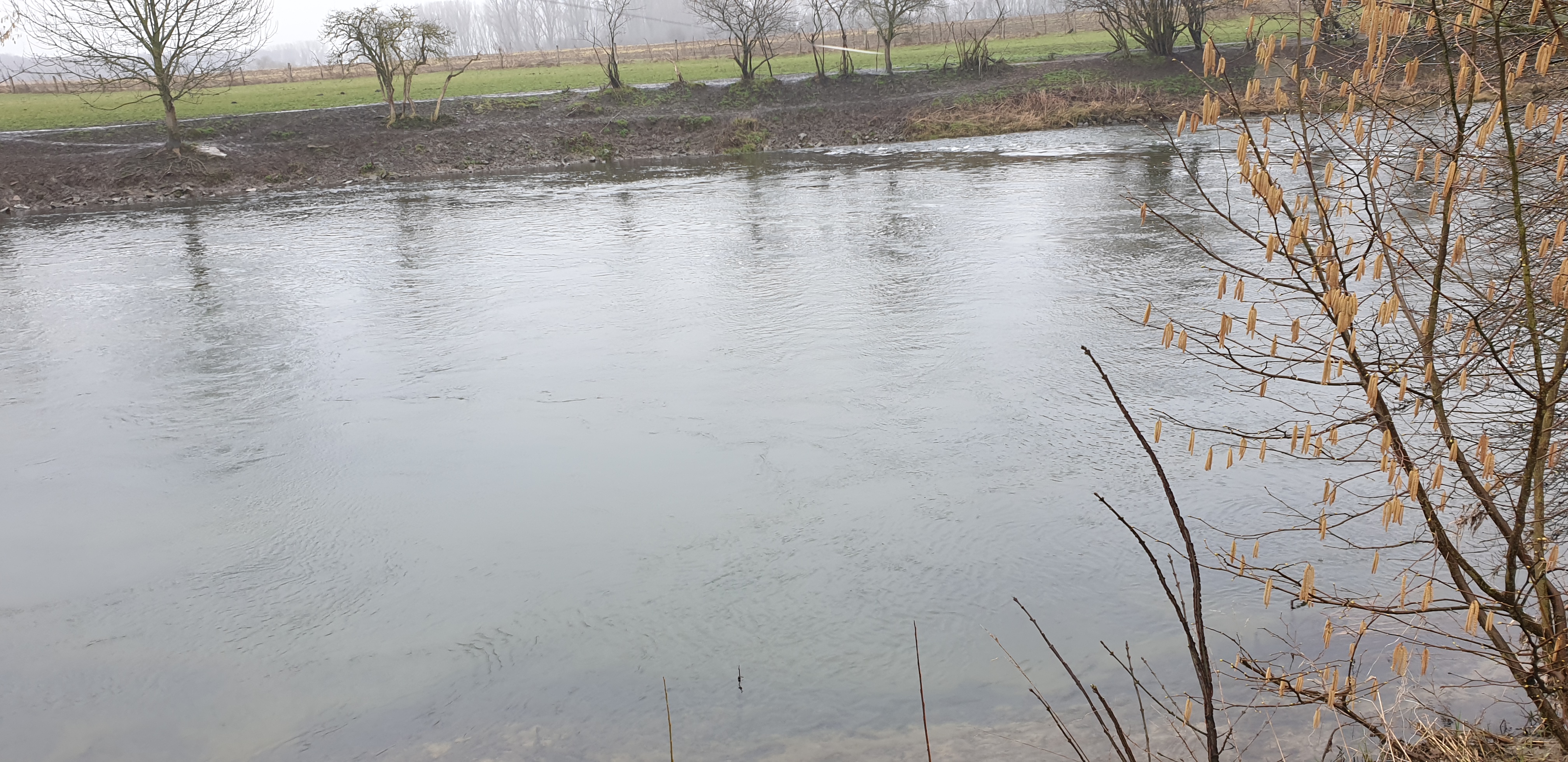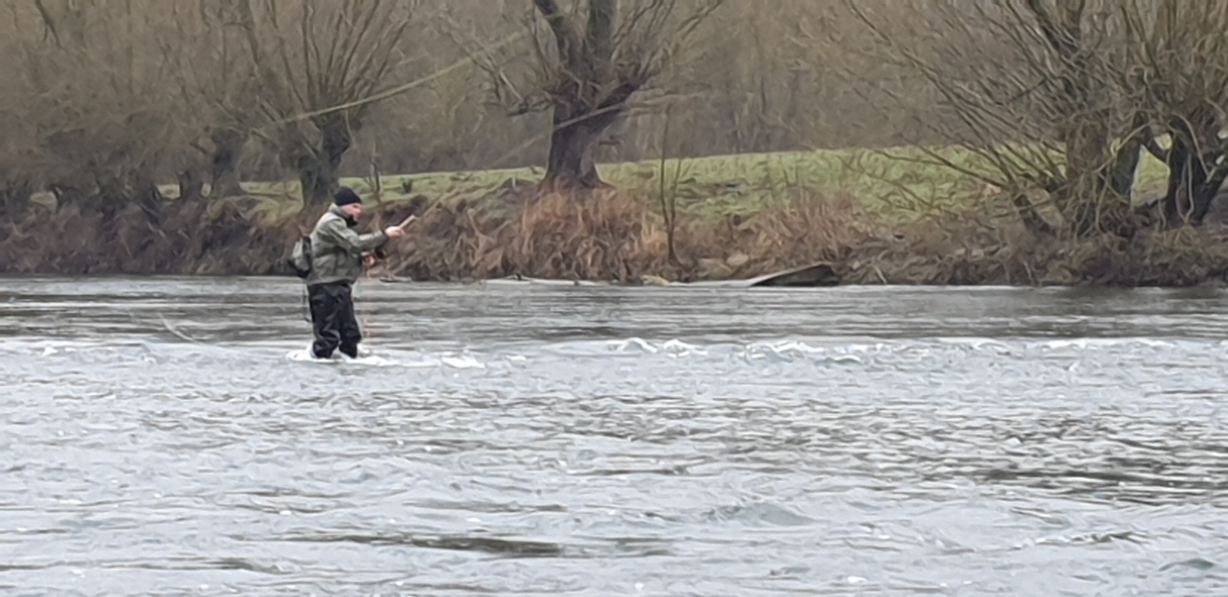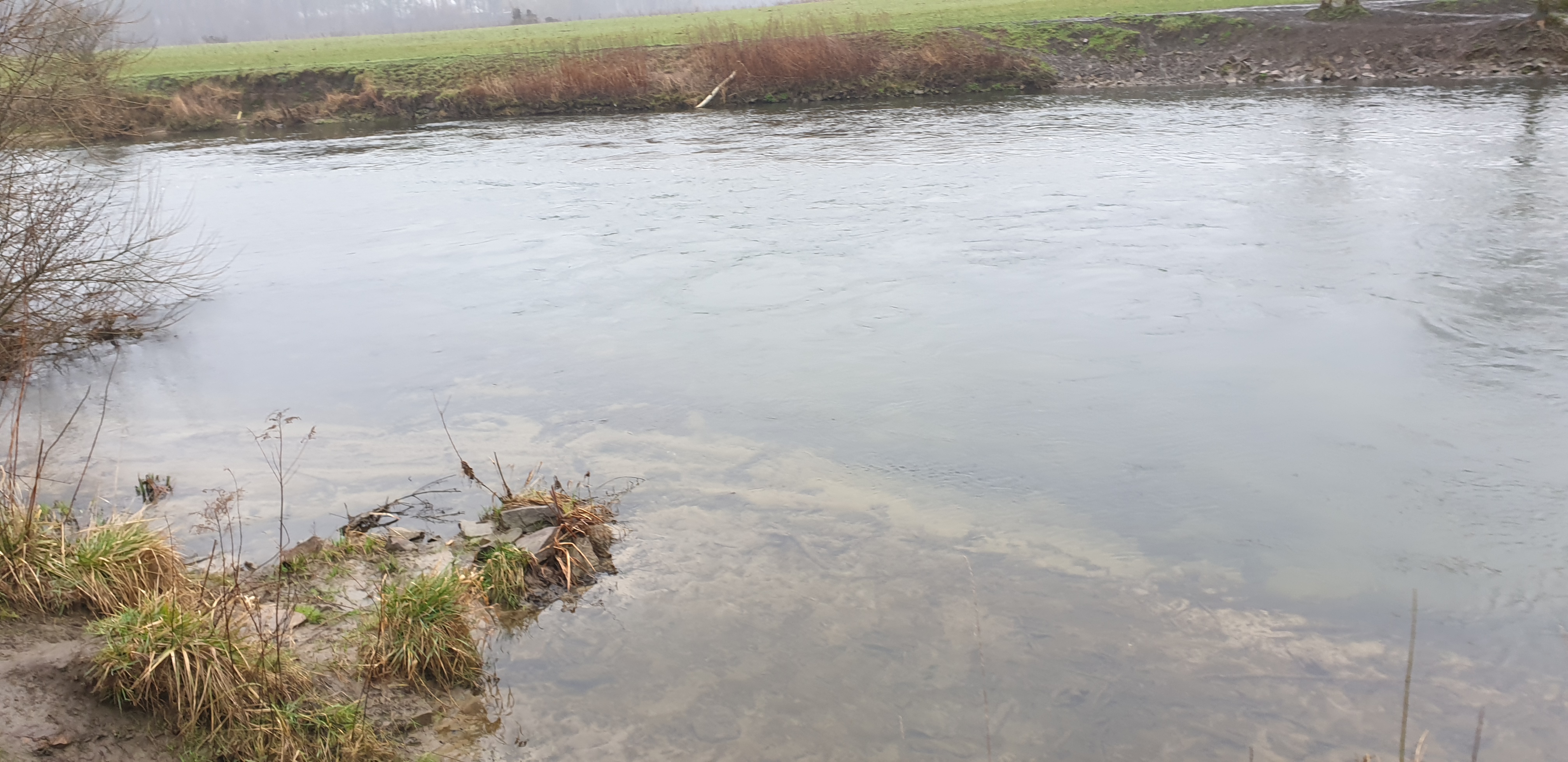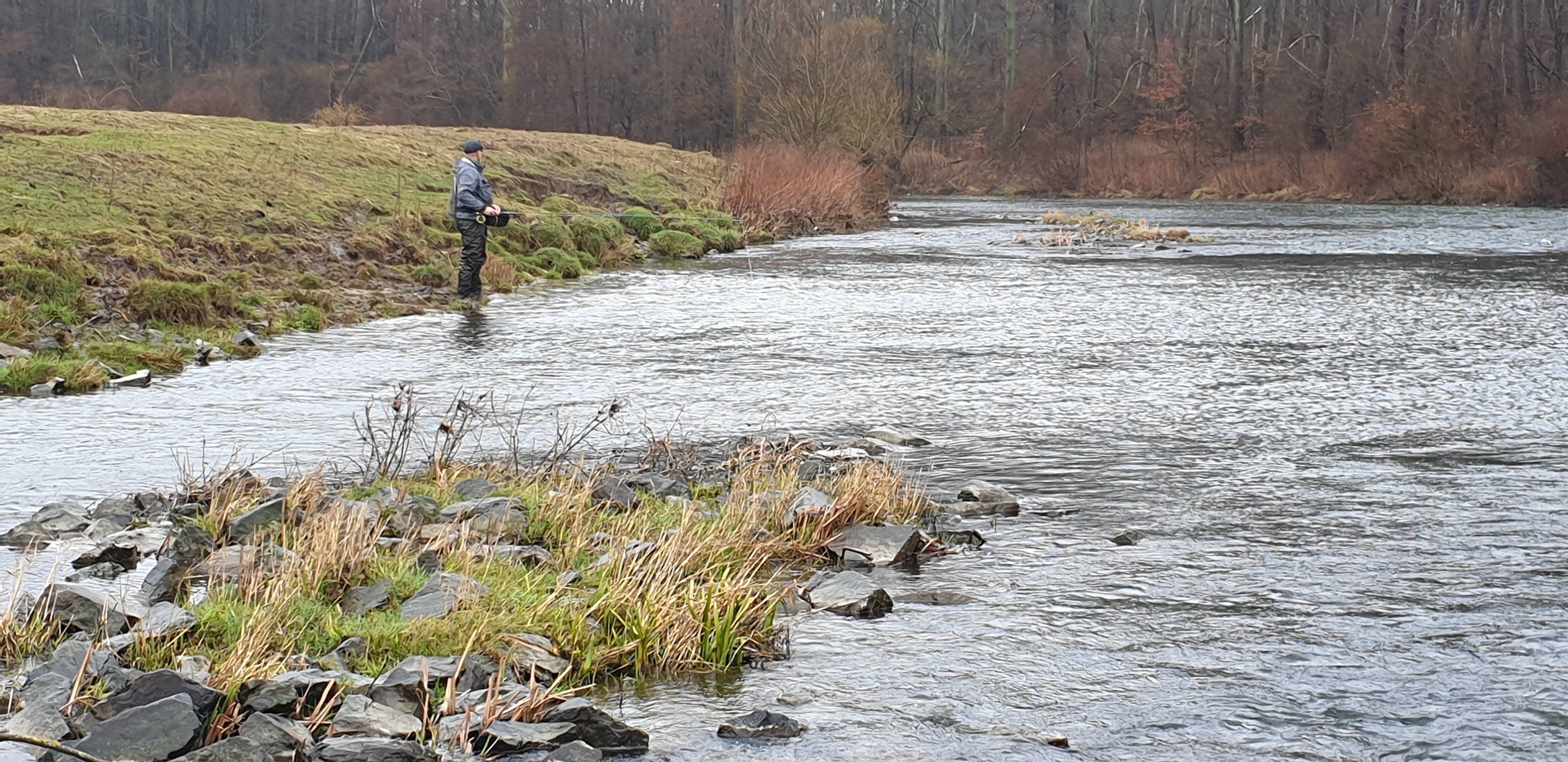 Man sieht es in online Videos immer häufiger, Zweihandruten oder Switch Ruten für den Lachs- und Meerforellenfang. Wäre das nichts für die Karup Å im Sommer? Oder mal die Stunde Fahrt auf sich nehmen und damit am Rhein auf Rapfen angeln? Oder man lernt den Wolfgang kennen, der einem sagt das er seit vielen Jahren schon um die Ecke an der Lippe mit der Zweihand Rute angelt. Von der Barbe bis zur großen Forelle und auch Rapfen wurden da schon gefangen. Und dass man mit der Zweihand Rute kaum Rückraum benötigt, hat an einigen Stellen deutliche Vorteile. Also haben wir Anfang März einen Termin ausgemacht, den Jörg mit eingepackt und sind Richtung Ahsen gefahren. Toll wenn man einen „Local“ dabei hat, der nicht nur die guten Stellen, sondern auch die Parkplätze in der Nähe des Flusses kennt. Der Wasserstand war leider noch immer etwas niedrig, wobei das Durchwaten an einigen Stellen schon recht kniffelig wurde. Ich glaube ich muss doch mal ein paar Euro in einen Watstock investieren. Wolfgang erklärte uns am Wasser wo es wie tief ist, wo man durchlaufen kann, wie in verschiedenen Ecken die Bodenstruktur ist und vieles mehr. Super Infos und man merkte, er kennt die Lippe wirklich wie seine Westentasche. Da ich im Zweihandwerfen noch recht frisch bin und außer ein paar Trockenübungen und ein paar Würfen am Vereinsteich noch keine Erfahrung gesammelt habe, gab es hier und da ein paar Problemchen. Im Nachhinein stellte sich heraus, dass der Skagit Schusskopf doch nicht falsch bemessen war, sondern es an meinem Wurfstil lag. Nach einer Anfangsphase kam ich jedoch klar und legte los. Die größere Reichweite ohne Rückraum zu nutzen macht die Zweihandrute an der Lippe zur besten Wahl! Ähnlich wie an den Auen kann man in die Strömungskanten auf der anderen Uferseite werfen und die Fliege in der Deaddrift präsentieren. Mit einem Single Spey Cast ist die Fliege nach vollendeter Drift auch ruck zuck wieder auf der anderen Uferseite. Gefangen wurde an diesem Tag leider nichts. Im Grunde war es auch eher unwahrscheinlich, Wasserstand, Temperatur und Jahreszeit waren alles andere als Fanggaranten. Aber Fisch war auch nicht das oberste Ziel. Der gemeinsame Ausflug machte wie erwartet einen riesen Spaß, ich habe sehr viel über die Lippe und das Zweihandwerfen gelernt und die neu renaturierten Bereiche sind für einen Gewässerwart eine Augenweide. Toll was der Landesfischereiverband, die Bezirksregierung sowie Städte und Kommunen da im Rahmen der WRRL auf die Beine gestellt haben. Überschwemmungsflächen, Flachwasserzonen, Totholz im Fluss, alles vorhanden. Alles in allem eine Tour die bei etwas besseren Wetterbedingungen auf jeden Fall nach Wiederholung schreit!